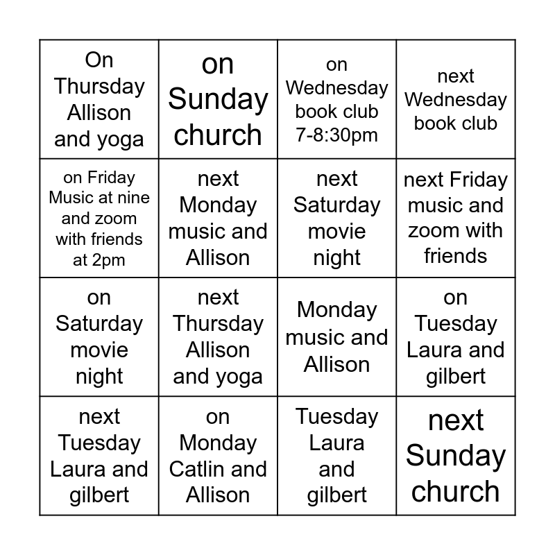 This bingo card has 16 words: on Monday Catlin and Allison, on Tuesday Laura and gilbert, on Wednesday book club 7-8:30pm, On Thursday Allison and yoga, on Saturday movie night, on Sunday church, Monday music and Allison, Tuesday Laura and gilbert, on Friday Music at nine and zoom with friends at 2pm, next Monday music and Allison, next Tuesday Laura and gilbert, next Wednesday book club, next Thursday Allison and yoga, next Friday music and zoom with friends, next Saturday movie night and next Sunday church.