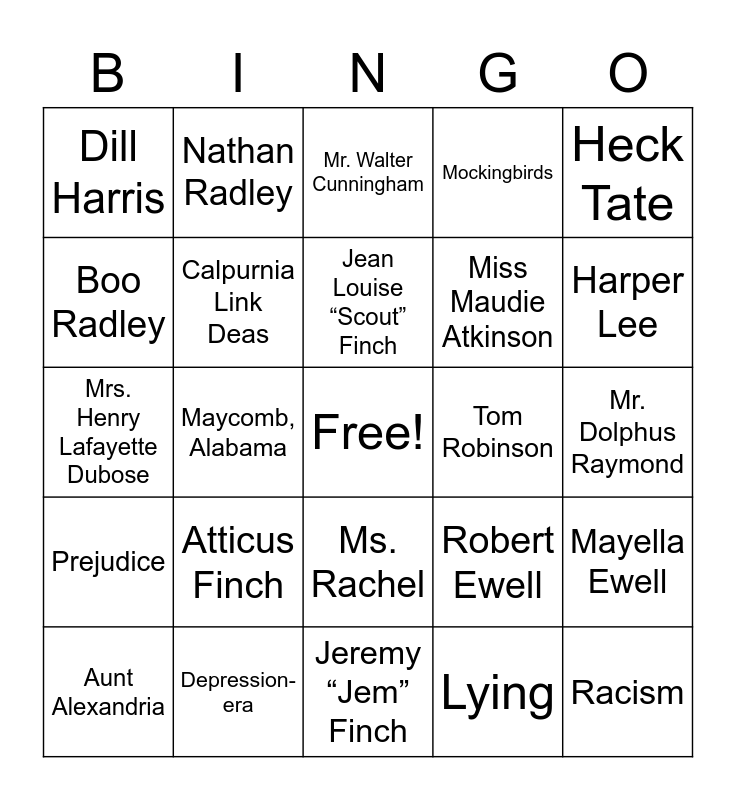 This bingo card has a free space and 25 words: Atticus Finch, Jeremy “Jem” Finch, Jean Louise “Scout” Finch, Aunt Alexandria, Heck Tate, Dill Harris, Boo Radley, Nathan Radley, Tom Robinson, Ms. Rachel, Miss Maudie Atkinson, Mrs. Henry Lafayette Dubose, Robert Ewell, Mayella Ewell, Calpurnia Link Deas, Mr. Underwood, Mr. Dolphus Raymond, Mr. Walter Cunningham, Harper Lee, Maycomb, Alabama, Racism, Depression-era, Prejudice, Mockingbirds and Lying.