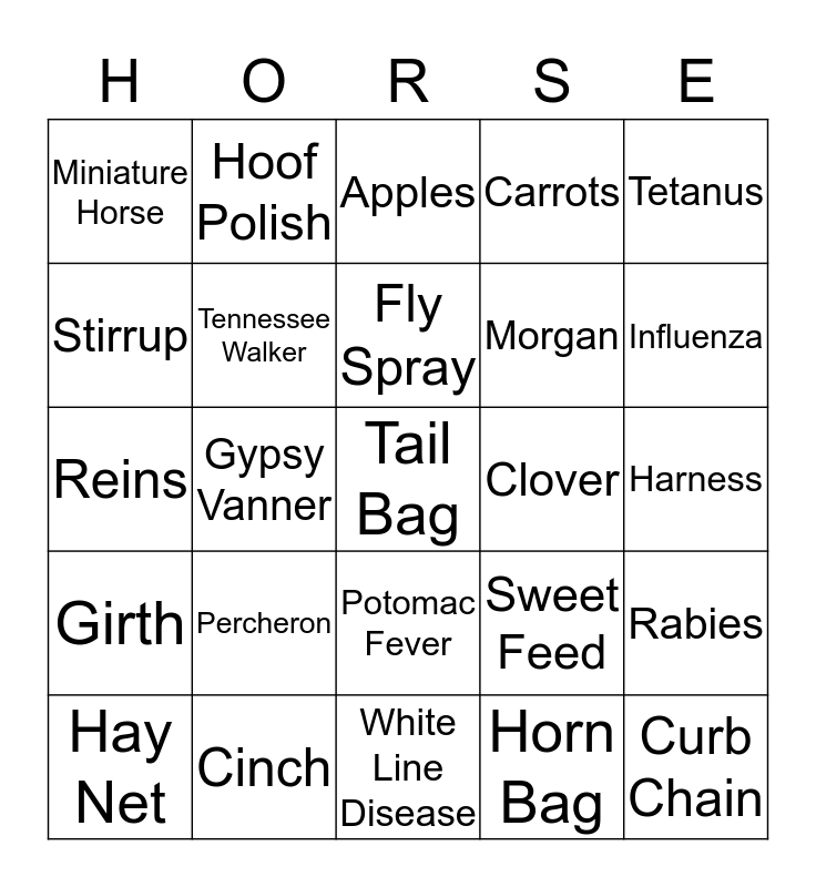 This bingo card has a free space and 24 words: Percheron, Cinch, Fly Spray, Hay Net, Tetanus, Miniature Horse, Stirrup, Hoof Polish, Clover, Potomac Fever, Morgan, Reins, Sweet Feed, Rabies, Tennessee Walker, Horn Bag, Harness, Apples, Influenza, Gypsy Vanner, Curb Chain, Girth, Carrots and White Line Disease.