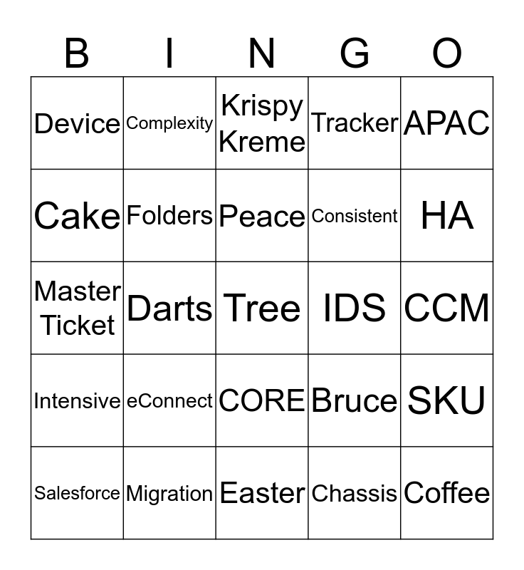 This bingo card has a free space and 24 words: eConnect, Migration, Peace, Salesforce, APAC, Device, Cake, Complexity, IDS, CORE, Consistent, Master Ticket, Bruce, SKU, Folders, Chassis, CCM, Krispy Kreme, HA, Darts, Coffee, Intensive, Tracker and Easter.