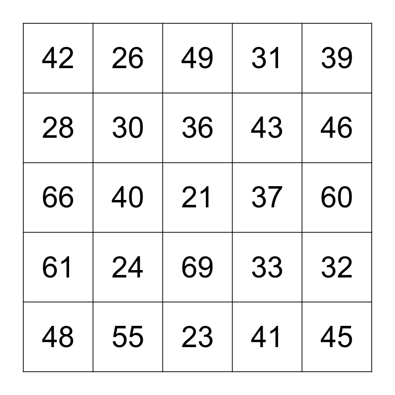 This bingo card has 51 words: 20, 21, 22, 23, 24, 25, 26, 27, 28, 29, 30, 31, 32, 33, 34, 35, 36, 37, 38, 39, 40, 41, 42, 43, 44, 45, 46, 47, 48, 49, 50, 51, 52, 53, 56, 55, 54, 47, 48, 49, 60, 61, 62, 63, 64, 65, 66, 67, 68, 69 and 70.