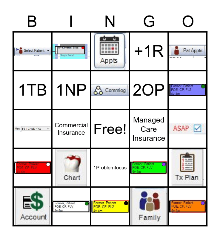 This bingo card has 17 images, a free space and 7 words: Managed Care Insurance, 1NP, 1TB, +1R, Commercial Insurance, 1Problemfocus and 2OP.