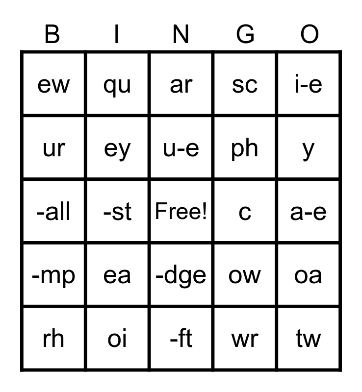 This bingo card has a free space and 24 words: ea, oi, u-e, rh, i-e, ew, ur, qu, c, -dge, ph, -all, ow, oa, ey, wr, a-e, ar, y, -st, tw, -mp, sc and -ft.