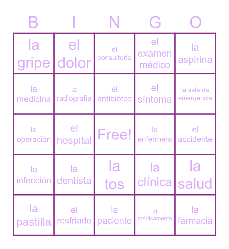 This bingo card has a free space and 24 words: la dentista, el resfriado, el antibiótco, la pastilla, la aspirina, la gripe, la medicina, el dolor, la enfermera, la tos, el síntoma, la operación, la clínica, la salud, la radiografía, el medicamento, el accidente, el consultorio, la sala de emergencia, el hospital, la farmacia, la infección, el examen médico and la paciente.