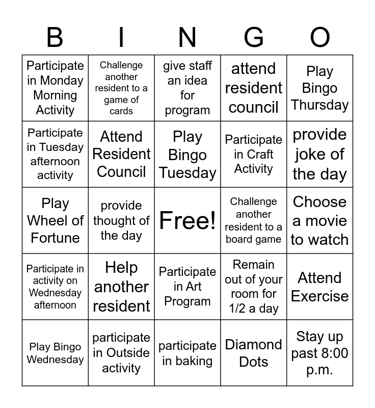 This bingo card has a free space and 24 words: Help another resident, participate in Outside activity, Play Bingo Tuesday, Play Bingo Wednesday, Play Bingo Thursday, Participate in Monday Morning Activity, Participate in Tuesday afternoon activity, Challenge another resident to a game of cards, Challenge another resident to a board game, Participate in Art Program, Participate in Craft Activity, Play Wheel of Fortune, Remain out of your room for 1/2 a day, Attend Exercise, Attend Resident Council, Diamond Dots, Choose a movie to watch, give staff an idea for program, provide joke of the day, provide thought of the day, Stay up past 8:00 p.m., Participate in activity on Wednesday afternoon, attend resident council and participate in baking.