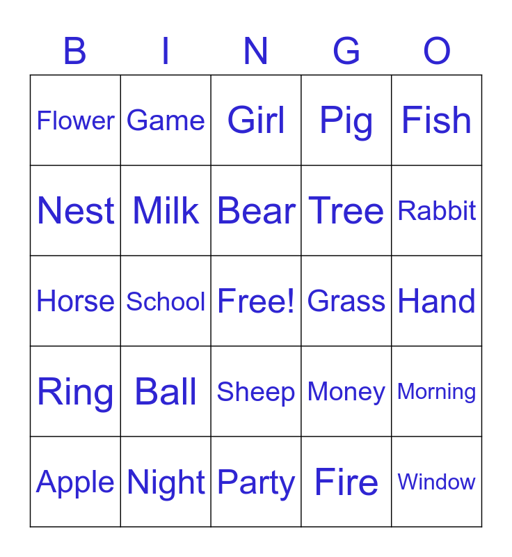 This bingo card has a free space and 24 words: Apple, Ball, Bear, Fire, Fish, Flower, Game, Girl, Grass, Hand, Horse, Milk, Money, Morning, Nest, Night, Party, Pig, Rabbit, Ring, School, Sheep, Tree and Window.