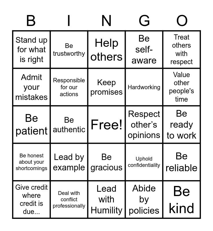 This bingo card has a free space and 24 words: Lead by example, Deal with conflict professionally, Keep promises, Give credit where credit is due..., Treat others with respect, Stand up for what is right, Admit your mistakes, Be trustworthy, Respect other’s opinions, Be gracious, Hardworking, Be patient, Uphold confidentiality, Be reliable, Responsible for our actions, Abide by policies, Be ready to work, Help others, Value other people's time, Be authentic, Be kind, Be honest about your shortcomings, Be self-aware and Lead with Humility.