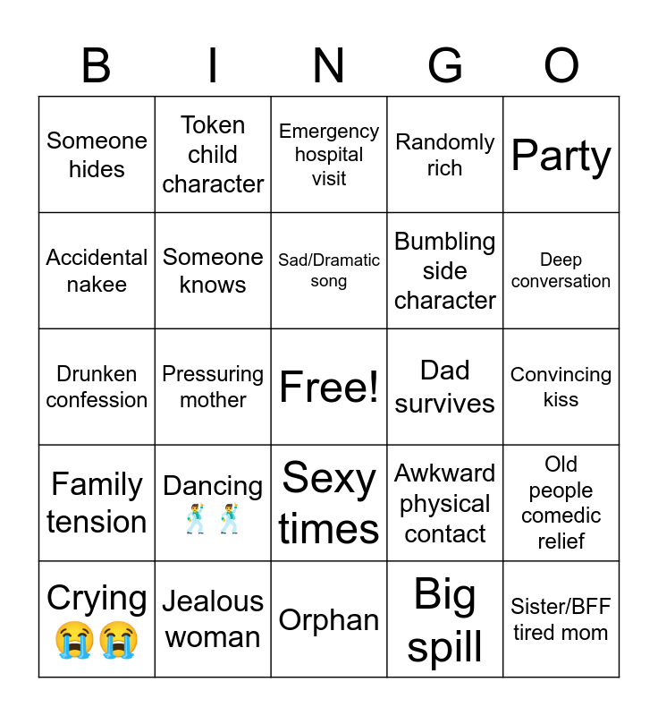 This bingo card has a free space and 29 words: Crying ππ, Wedding interruption π‘π‘, Pressuring mother, Overheard convo to misunderstanding, Someone hides, Emergency hospital visit, Someone knows, Dancing πΊπΊ, Dad survives, Jealous woman, Convincing kiss, Sister/BFF tired mom, Orphan, Big spill, Deep conversation, Fight, Sexy times, Family tension, Party, Drunken confession, Awkward physical contact, Male friend in failing relationship, Bumbling side character, Accidental nakee, Randomly rich, Token child character, Old people comedic relief, Sad/Dramatic song and Girl is β¨quirkyβ¨.