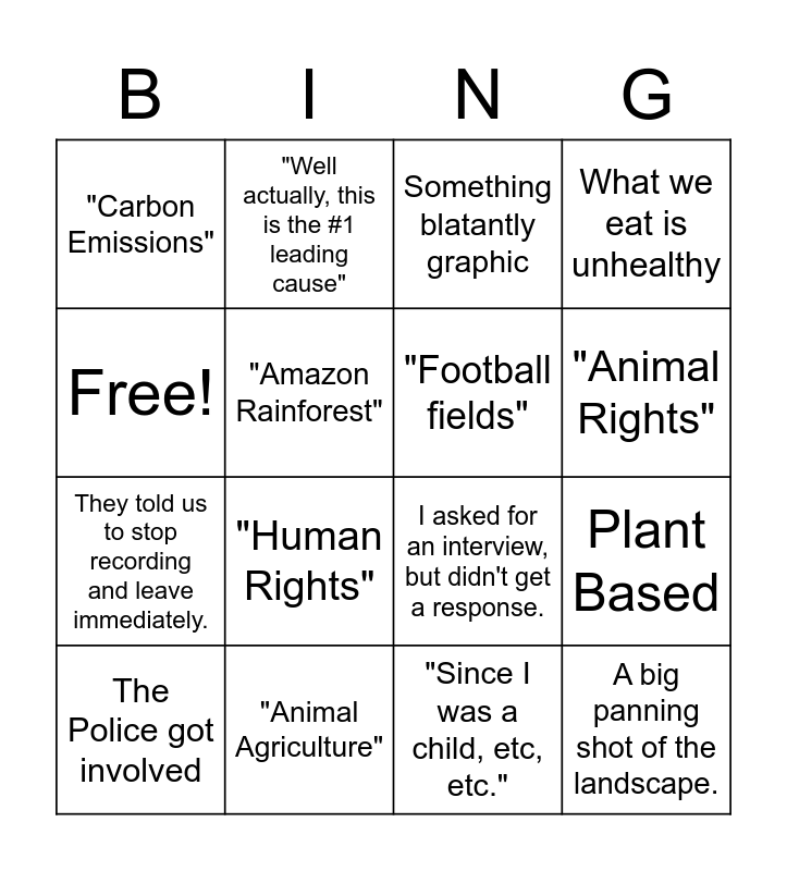This bingo card has 16 words: "Animal Agriculture", Plant Based, Something blatantly graphic, "Carbon Emissions", They told us to stop recording and leave immediately., "Well actually, this is the #1 leading cause", I asked for an interview, but didn't get a response., "Since I was a child, etc, etc.", Free!, "Amazon Rainforest", The Police got involved, What we eat is unhealthy, "Human Rights", "Animal Rights", "Football fields" and A big panning shot of the landscape..
