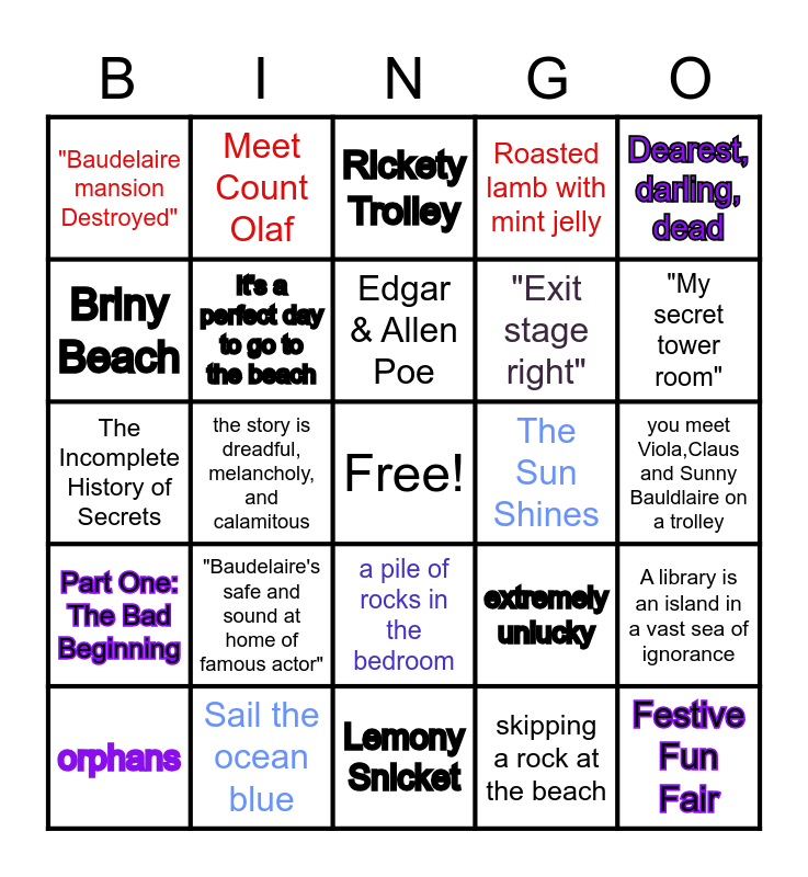 This bingo card has a free space and 24 words: orphans, "Baudelaire's safe and sound at home of famous actor", Edgar & Allen Poe, skipping a rock at the beach, Dearest, darling, dead, "Baudelaire mansion Destroyed", Meet Count Olaf, Rickety Trolley, The Sun Shines, you meet Viola,Claus and Sunny Bauldlaire on a trolley, The Incomplete History of Secrets, It's a perfect day to go to the beach, extremely unlucky, A library is an island in a vast sea of ignorance, Briny Beach, Sail the ocean blue, Lemony Snicket, Roasted lamb with mint jelly, "My secret tower room", Part One: The Bad Beginning, the story is dreadful, melancholy, and calamitous, a pile of rocks in the bedroom, "Exit stage right" and Festive Fun Fair.
