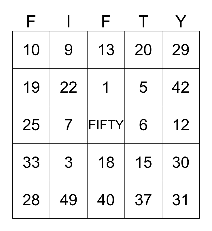 This bingo card has a free space and 24 words: 3, 49, 1, 28, 29, 10, 19, 9, 6, 18, 5, 25, 15, 30, 22, 37, 12, 13, 42, 7, 31, 33, 20 and 40.