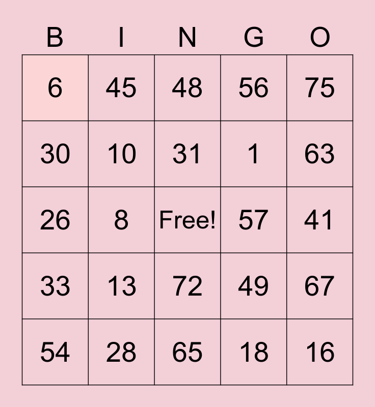 This bingo card has a free space and 24 words: 13, 28, 31, 54, 75, 6, 30, 45, 57, 72, 1, 26, 49, 67, 10, 18, 41, 48, 63, 8, 16, 33, 56 and 65.