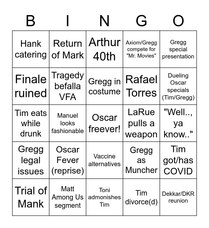 This bingo card has a free space and 24 words: Oscar Fever (reprise), Matt Among Us segment, Gregg in costume, Trial of Mank, Gregg special presentation, Hank catering, Finale ruined, Return of Mark, LaRue pulls a weapon, Vaccine alternatives, Rafael Torres, Tim eats while drunk, Gregg as Muncher, Tim got/has COVID, Tragedy befalla VFA, Tim divorce(d), "Well.., ya know..", Arthur 40th, Dueling Oscar specials (Tim/Gregg), Manuel looks fashionable, Dekkar/DKR reunion, Gregg legal issues, Axiom/Gregg compete for "Mr. Movies" and Toni admonishes Tim.