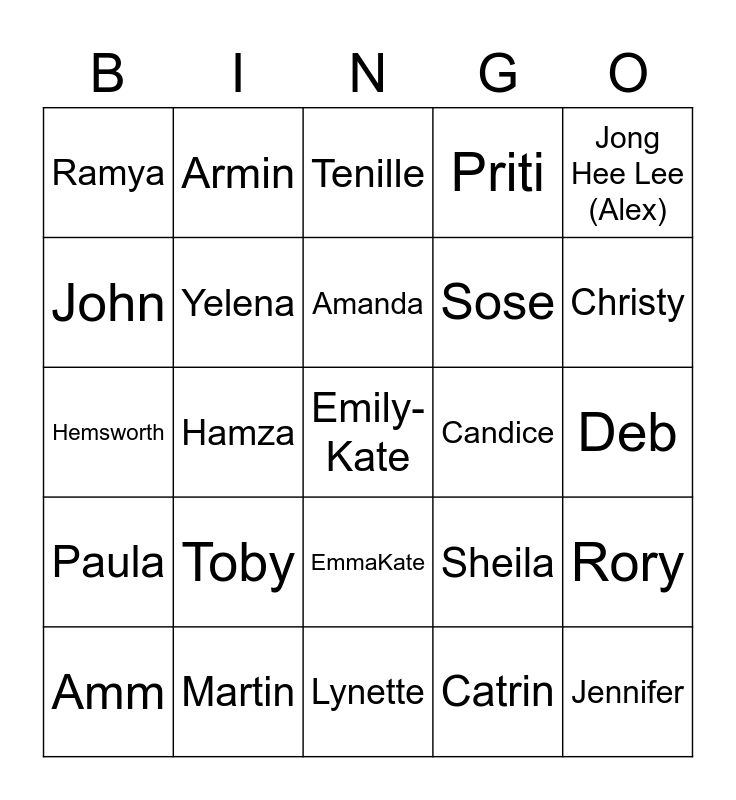 This bingo card has 30 words: Martin, Dionne, Hamza, Lefan Qiu (Cindy), Ramya, Tenille, Yelena, EmmaKate, Candice, Lynette, Deb, Emily-Kate, Catrin, Jennifer, Christy, Beyonce, Sheila, Paula, Toby, Jong Hee Lee (Alex), Hemsworth, Oprah, Armin, Sose, John, Priti, Rory, Amm, Amanda and Vimal.