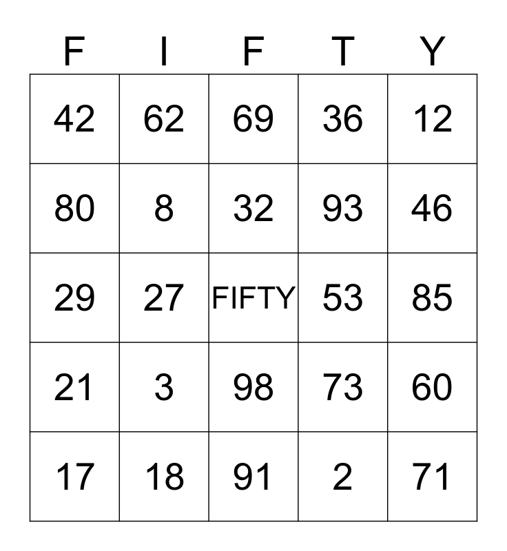 This bingo card has a free space and 24 words: 3, 18, 32, 17, 12, 42, 80, 62, 53, 98, 93, 29, 73, 60, 8, 2, 85, 69, 46, 27, 71, 21, 36 and 91.