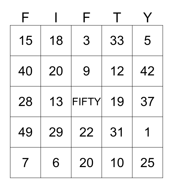 This bingo card has a free space and 24 words: 29, 6, 9, 7, 5, 15, 40, 18, 19, 22, 12, 28, 31, 1, 20, 10, 37, 3, 42, 13, 25, 49, 33 and 20.