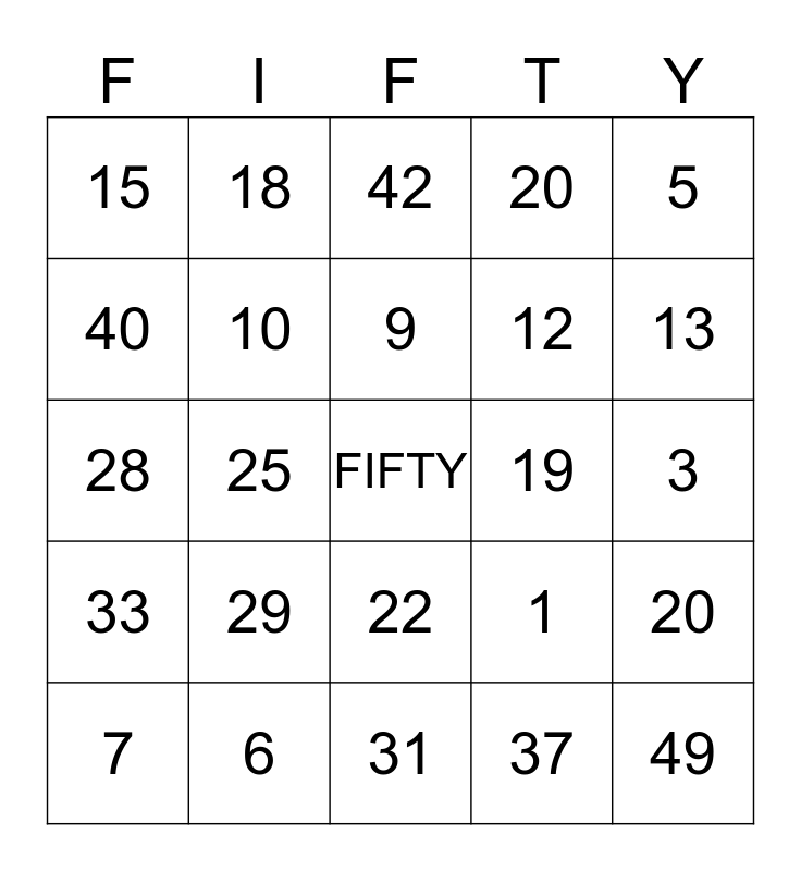 This bingo card has a free space and 24 words: 29, 6, 9, 7, 5, 15, 40, 18, 19, 22, 12, 28, 1, 20, 10, 37, 3, 42, 13, 25, 49, 33, 20 and 31.