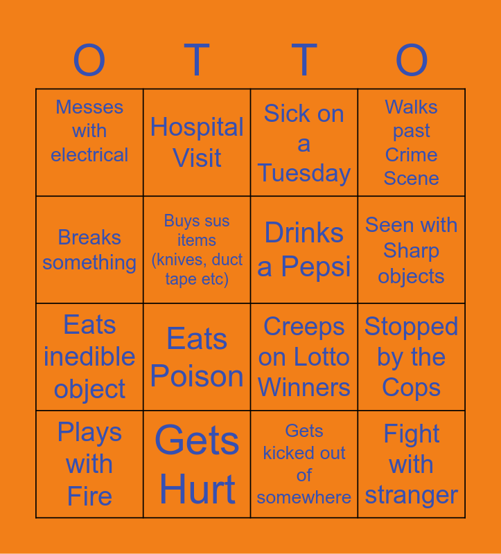 This bingo card has 16 words: Gets Hurt, Stopped by the Cops, Sick on a Tuesday, Messes with electrical, Eats inedible object, Hospital Visit, Creeps on Lotto Winners, Gets kicked out of somewhere, Breaks something, Buys sus items (knives, duct tape etc), Plays with Fire, Walks past Crime Scene, Eats Poison, Seen with Sharp objects, Drinks a Pepsi and Fight with stranger.