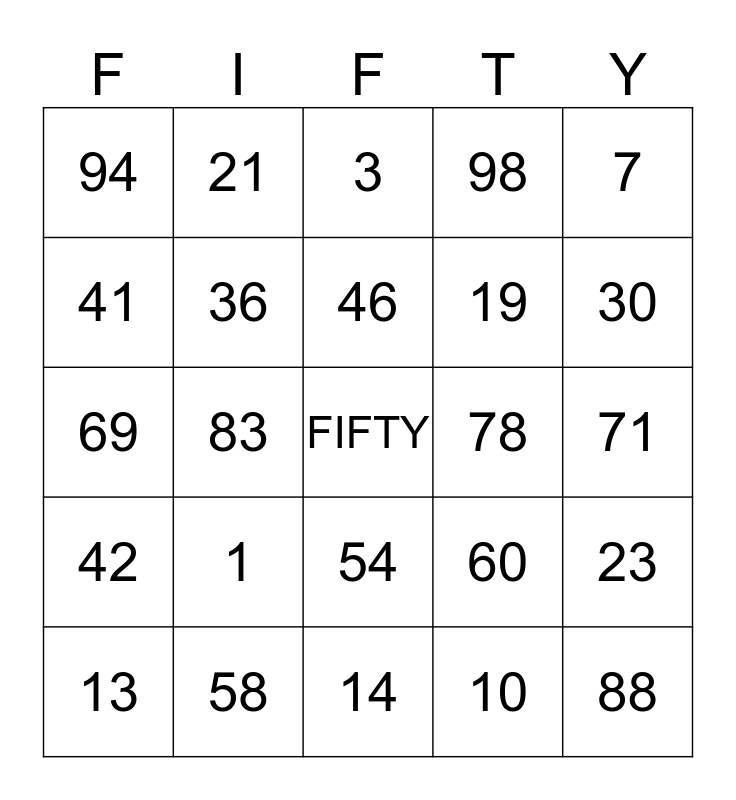 This bingo card has a free space and 24 words: 1, 58, 46, 13, 7, 94, 41, 21, 78, 54, 19, 69, 60, 23, 36, 10, 71, 3, 30, 83, 88, 42, 98 and 14.