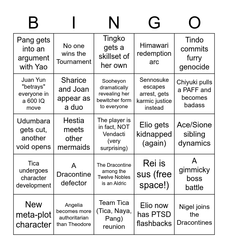 This bingo card has 25 words: A Dracontine defector, Team Tica (Tica, Naya, Pang) reunion, Sooheyon dramatically revealing her bewitcher form to everyone, New meta-plot character, Tindo commits furry genocide, Pang gets into an argument with Yao, Juan Yun "betrays" everyone in a 600 IQ move, No one wins the Tournament, Elio gets kidnapped (again), The Dracontine among the Twelve Nobles is an Aldric, Sennosuke escapes arrest, gets karmic justice instead, Udumbara gets cut, another void opens, Rei is sus (free space!), A gimmicky boss battle, Sharice and Joan appear as a duo, Nigel joins the Dracontines, Ace/Sione sibling dynamics, Tingko gets a skillset of her own, Chiyuki pulls a PAFF and becomes badass, Hestia meets other mermaids, The player is in fact, NOT Vendacti (very surprising), Angelia becomes more authoritarian than Theodore, Tica undergoes character development, Himawari redemption arc and Elio now has PTSD flashbacks.
