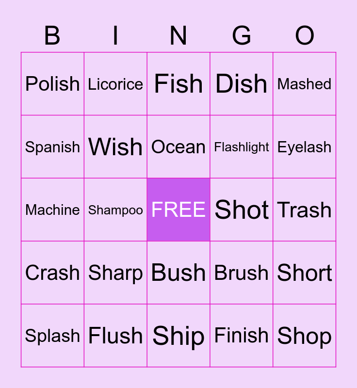 This bingo card has a free space and 24 words: Sharp, Flush, Ocean, Splash, Mashed, Polish, Spanish, Licorice, Shot, Bush, Flashlight, Machine, Brush, Short, Wish, Finish, Trash, Fish, Eyelash, Shampoo, Shop, Crash, Dish and Ship.