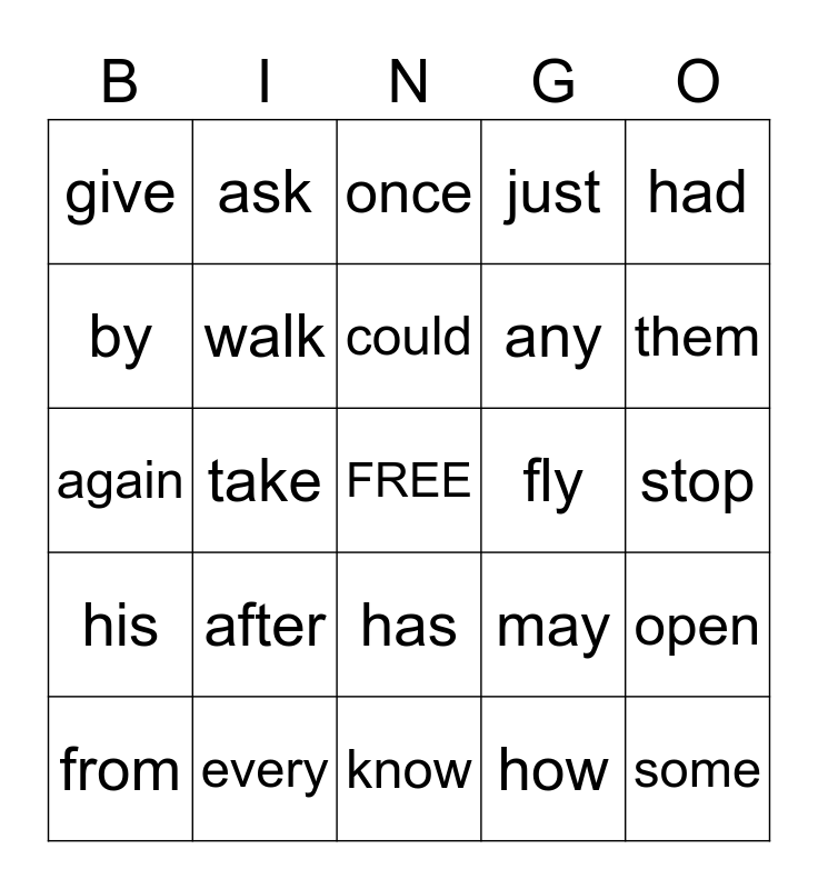 This bingo card has a free space and 24 words: after, every, could, from, had, give, by, ask, fly, has, any, again, may, open, walk, how, stop, once, them, take, some, his, just and know.