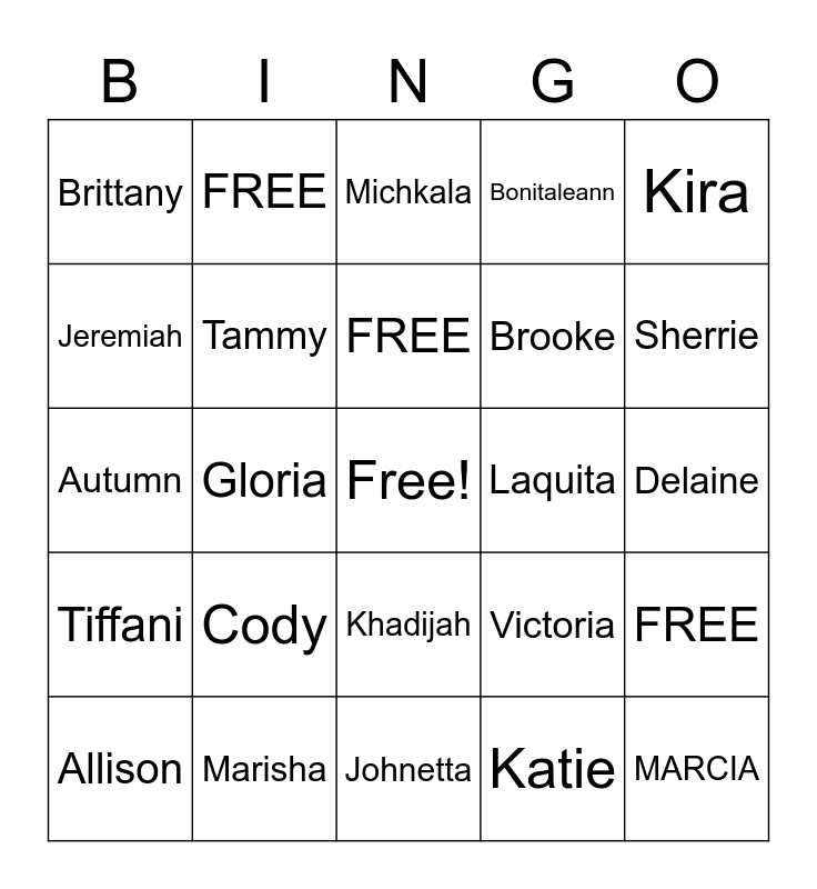 This bingo card has a free space and 29 words: Allison, Veronica, Gloria, Melanie, Brittany, Michkala, Tammy, Cody, Laquita, Marisha, Delaine, MARCIA, Johnetta, Katie, Sherrie, Olymphia, Khadijah, Tiffani, Kira, Autumn, Victoria, Ericka, Brooke, Jeremiah, Bonitaleann, FREE, FREE, FREE and FREE.