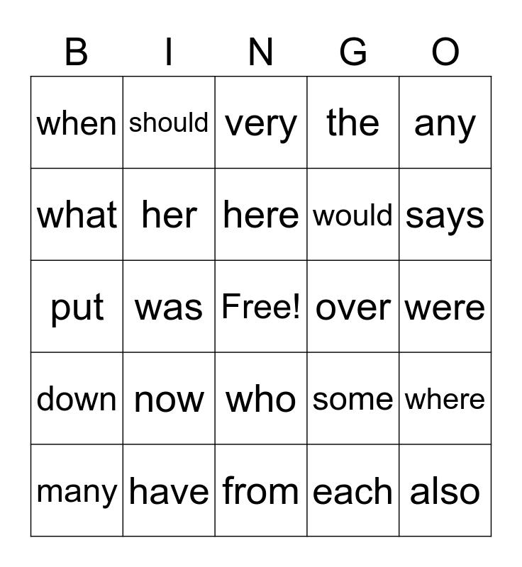 This bingo card has a free space and 34 words: could, each, she, why, down, her, any, many, should, does, here, very, between, your, over, says, have, put, now, some, who, they, when, were, from, also, the, number, would, what, how, was, where and come.