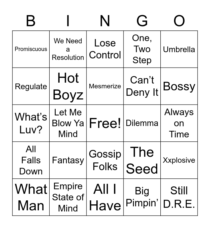 This bingo card has a free space and 40 words: Drop it Like It’s Hot, What’s Luv?, Area Code, Hot Boyz, Empire State of Mind, Gossip Folks, Mesmerize, Upgrade, Umbrella, All Falls Down, Let Me Blow Ya Mind, One, Two Step, Still D.R.E., Always on Time, Dilemma, Fantasy, Royal Flush, Promiscuous, Soldier, Lose Control, Xxplosive, Big Pimpin’, Can’t Deny It, Regulate, Da Rockwilder, California Love, Ice Cream, The Boy is Mine, Money Ain’t a Thang, Heartbreak Hotel, Yeah!, What Man, 10 Bricks, The Seed, Bossy, All I Have, Stutter, What You Want, We Need a Resolution and Make it Clap.