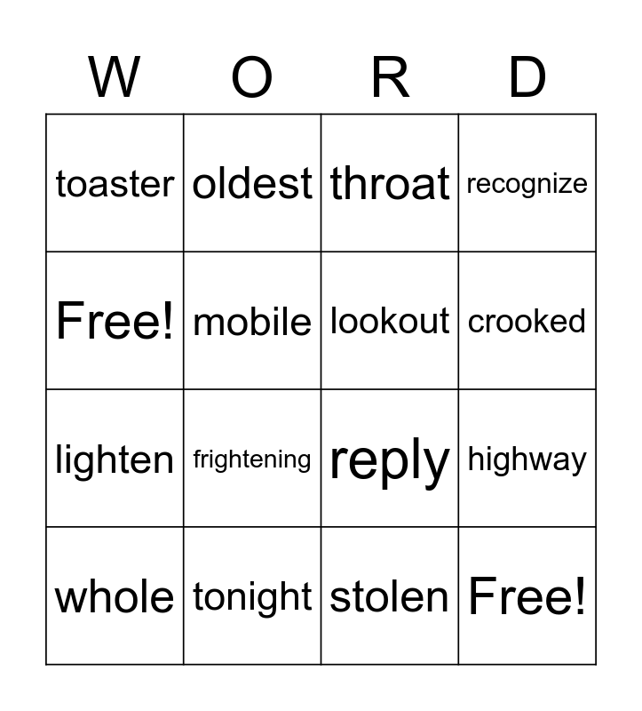 This bingo card has 16 words: tonight, highway, throat, toaster, lighten, oldest, reply, stolen, Free!, mobile, whole, recognize, frightening, crooked, lookout and Free!.