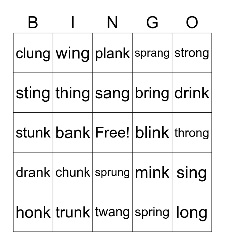 This bingo card has a free space and 34 words: bank, spring, swung, shrink, drank, thing, strong, honk, wing, clang, sang, plank, dunk, blank, blink, drink, trunk, stunk, chunk, mink, sprung, hung, clung, throng, twang, long, sprang, rang, bring, sting, think, bank, sing and dunk.