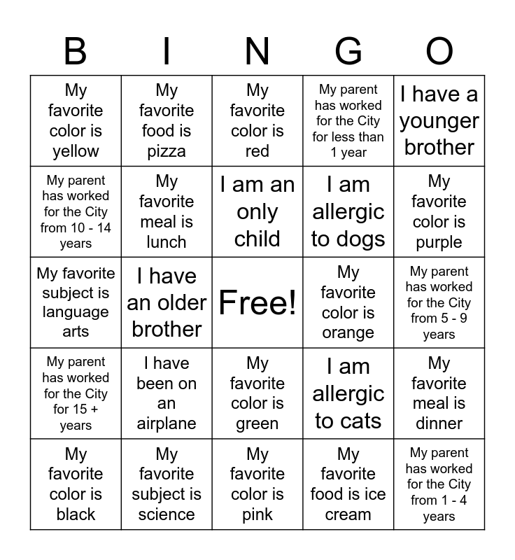 This bingo card has a free space and 37 words: I have a dog, My favorite meal is breakfast, I have a cat, My favorite meal is lunch, My favorite meal is dinner, I have been on an airplane, I am an only child, I have a younger sister, I have a younger brother, I have an older sister, I have an older brother, My parent has worked for the City for less than 1 year, My parent has worked for the City from 1 - 4 years, My parent has worked for the City from 5 - 9 years, My parent has worked for the City from 10 - 14 years, My parent has worked for the City for 15 + years, My favorite color is blue, My favorite color is red, My favorite color is green, My favorite color is orange, My favorite color is yellow, My favorite color is purple, My favorite color is black, My favorite color is pink, I had my hair cut last week, My favorite food is ice cream, My favorite food is pizza, My favorite food is hamburgers, I love to read, I love to play sports, My favorite subject is math, My favorite subject is science, My favorite subject is language arts, My favorite subject is history, I am allergic to cats, I am allergic to dogs and FREE SPACE.
