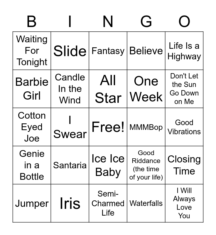 This bingo card has a free space and 24 words: Santaria, Iris, All Star, Jumper, Life Is a Highway, Waiting For Tonight, Barbie Girl, Slide, MMMBop, Ice Ice Baby, One Week, Cotton Eyed Joe, Good Riddance (the time of your life), Closing Time, Candle In the Wind, Waterfalls, Good Vibrations, Fantasy, Don't Let the Sun Go Down on Me, I Swear, I Will Always Love You, Genie in a Bottle, Believe and Semi-Charmed Life.