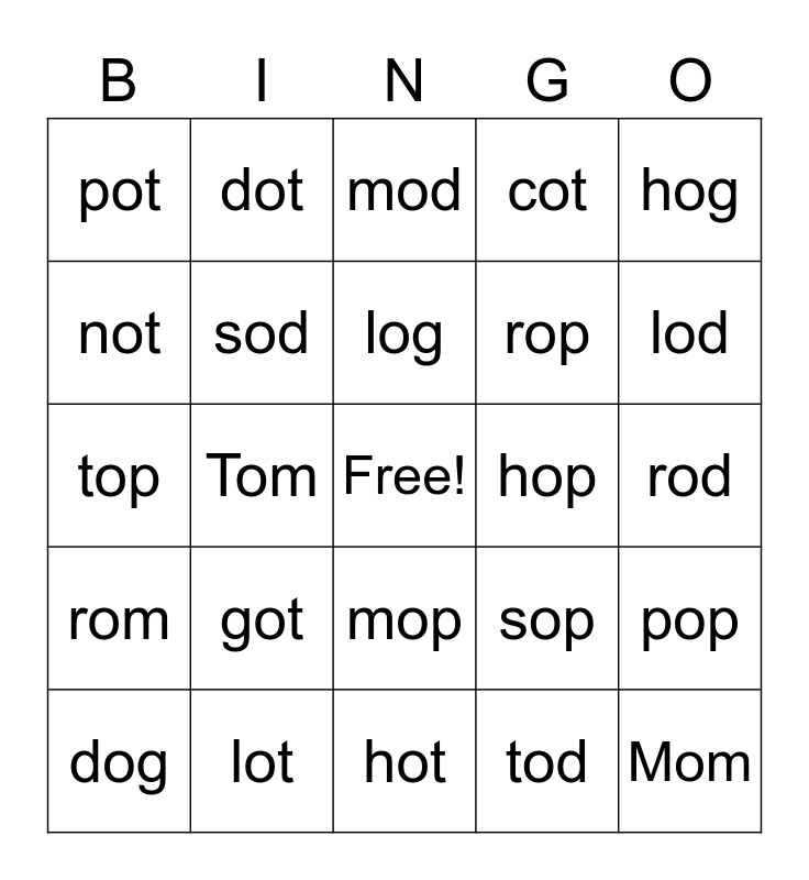 This bingo card has a free space and 24 words: got, lot, log, dog, hog, pot, not, dot, hop, mop, rop, top, sop, pop, sod, tod, rod, mod, lod, Tom, Mom, rom, cot and hot.