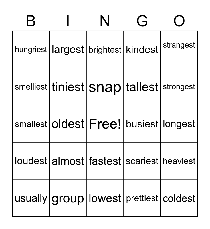 This bingo card has a free space and 24 words: almost, group, snap, usually, strangest, hungriest, smelliest, largest, busiest, fastest, tallest, smallest, scariest, heaviest, tiniest, prettiest, longest, brightest, strongest, oldest, coldest, loudest, kindest and lowest.