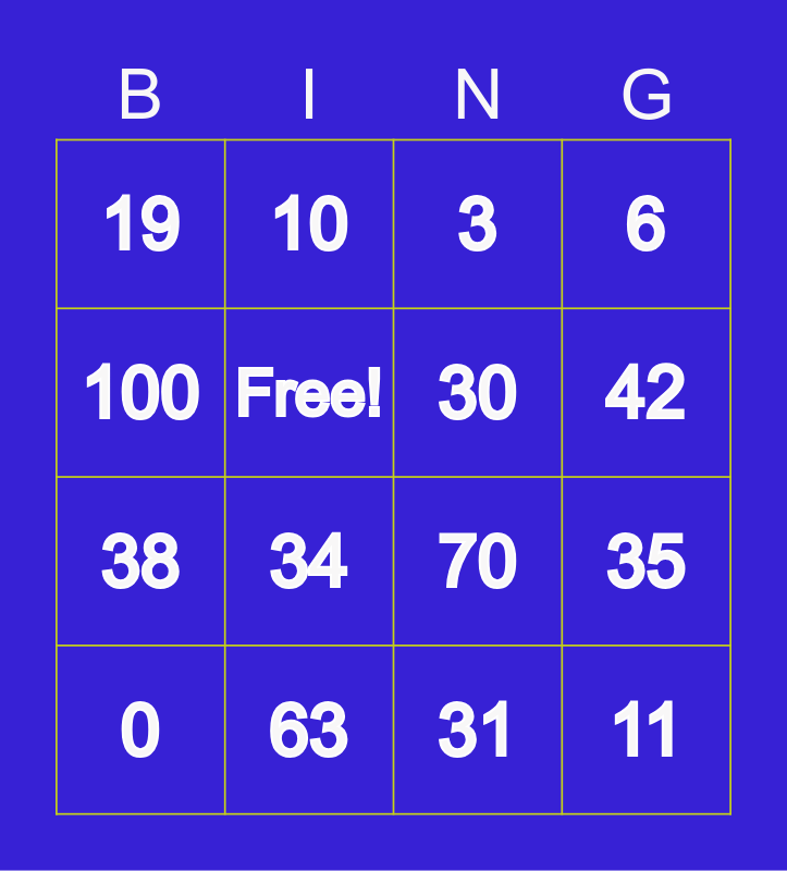 This bingo card has 50 words: 16, 0, 4, 28, 36, 20, 10, 56, Free!, 45, 30, 6, 14, 32, 9, 72, 42, 63, 1, 100, 35, 12, 19, 38, 5, 50, 34, 73, 3, 7, 37, 87, 22, 13, 26, 67, 89, 43, 8, 31, 102, 59, 69, 2, 91, 70, 62, 70, 11 and 23.