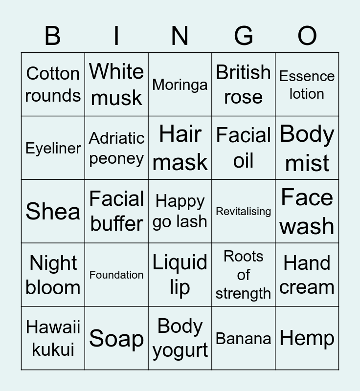 This bingo card has 100 words: Drops of youth, Serum, Face wash, Cleaner, Liquid peel, Jelly mist, Sheet mask, Vitamin e, Toner, Charcoal mask, Vitamin C, SPF, Tea tree, Soap, Aloe, Sensitive, Facial oil, CBD, Drops of light, Carrot, Seaweed, Combination skin, Exfoliator, Camomile, Oils of life, Revitalising, Essence lotion, Roots of strength, Soft brush, Magic flannel, Facial buffer, Cotton rounds, Maca root, Guarana and coffee, Banana, Hair mask, Hand cream, Almond, Nail care, Hemp, Self care, Fair trade, Shea, Bath lilly, Body mist, Moringa, Body milk, Body scrub, Body butter, Body yogurt, Shower gel, COTE, Coconut, Lemon, Strawberry, Hand sanitiser, Almond milk and honey, Mango, Pink grapefruit, British rose, Satsuma, Argan oil, Olive, Fuji green tea, Peppermint, Grapeseed serum, Bath blends, Spa of the world, Pillow mist, Concealer, Face powder, Foundation, Fresh nude, Matte clay, Instablur, Blush, Bamboo brushes, Eyeliner, Own your naturals, Paint in colour, Brow sport, Happy go lash, Lipscruff, Liquid lip, Lip juicer, White musk, Leau, Flora, Black musk, Night bloom, Gift sets, Reed diffuser, Consultant, Hawaii kukui, Adriatic peoney, Eye roller, Skin defence, Coco calming, Mint mattifying and Dewy rose.