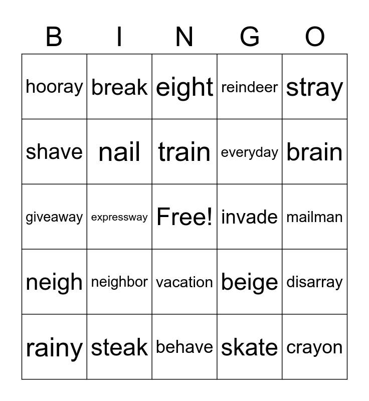 This bingo card has a free space and 24 words: neighbor, steak, train, rainy, stray, hooray, shave, break, invade, vacation, everyday, giveaway, beige, disarray, nail, skate, mailman, eight, brain, expressway, crayon, neigh, reindeer and behave.