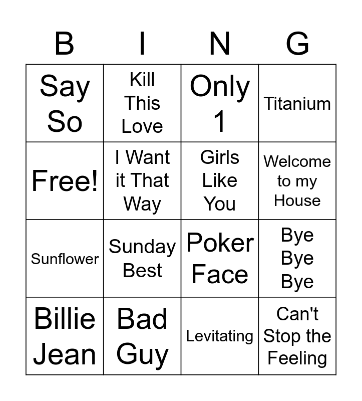 This bingo card has 39 words: Shaky Shaky, Dreams, Watermelon Sugar, Girls Like You, Umbrella, Genie in a Bottle, Welcome to my House, NASA, Free!, Can't Stop the Feeling, Bye Bye Bye, Titanium, Billie Jean, Levitating, Bad Guy, The Time (Dirty Bit), Blinding Lights, Say So, Umbrella, I Gotta Feeling, I Want it That Way, Happy, Sunflower, Sunday Best, Toosie Slide, My Boo, Humble, Do It, Dynamite, Kill This Love, Taki taki, Thriller, Only 1, Girls Like You, Summer, Baby, Born this Way, Poker Face and Shake it Off.