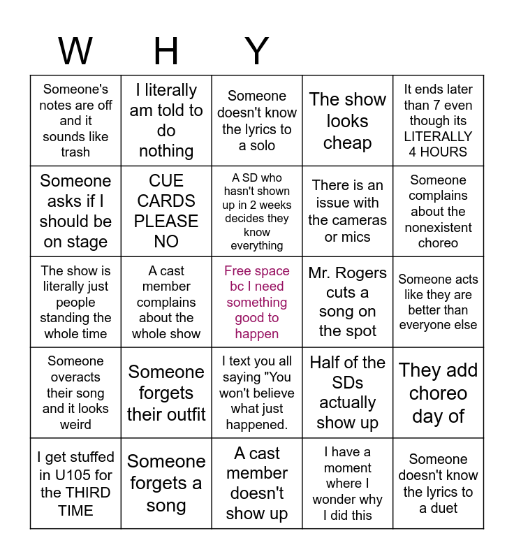 This bingo card has a free space and 24 words: Someone forgets their outfit, Someone forgets a song, A SD who hasn't shown up in 2 weeks decides they know everything, I get stuffed in U105 for the THIRD TIME, It ends later than 7 even though its LITERALLY 4 HOURS, Someone's notes are off and it sounds like trash, Someone asks if I should be on stage, I literally am told to do nothing, Mr. Rogers cuts a song on the spot, I text you all saying "You won't believe what just happened., There is an issue with the cameras or mics, The show is literally just people standing the whole time, Half of the SDs actually show up, They add choreo day of, CUE CARDS PLEASE NO, I have a moment where I wonder why I did this, Someone acts like they are better than everyone else, Someone doesn't know the lyrics to a solo, Someone complains about the nonexistent choreo, A cast member complains about the whole show, Someone doesn't know the lyrics to a duet, Someone overacts their song and it looks weird, The show looks cheap and A cast member doesn't show up.
