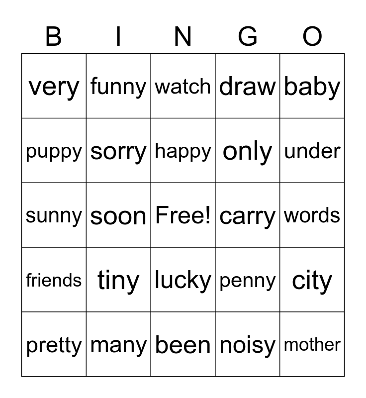 This bingo card has a free space and 24 words: tiny, many, happy, pretty, baby, very, puppy, funny, carry, lucky, only, sunny, penny, city, sorry, noisy, words, watch, under, soon, mother, friends, draw and been.