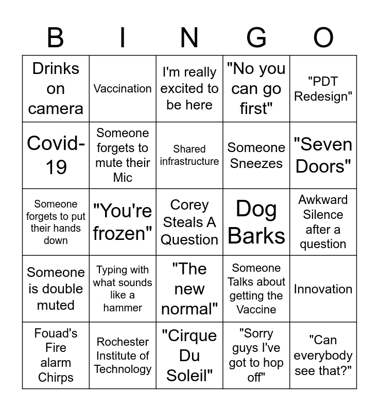 This bingo card has a free space and 28 words: Innovation, "I guess I'll go First", Someone Sneezes, "Sorry guys I've got to hop off", Covid-19, I'm really excited to be here, Vaccination, Someone is double muted, Dog Barks, Fouad's Fire alarm Chirps, Someone forgets to put their hands down, "No you can go first", Rochester Institute of Technology, "Cirque Du Soleil", "Seven Doors", EBITDA, Typing with what sounds like a hammer, Someone forgets to mute their Mic, Shared infrastructure, "The new normal", Drinks on camera, Power BI, "Can everybody see that?", "You're frozen", Awkward Silence after a question, Someone Talks about getting the Vaccine, "PDT Redesign" and Adding Value.