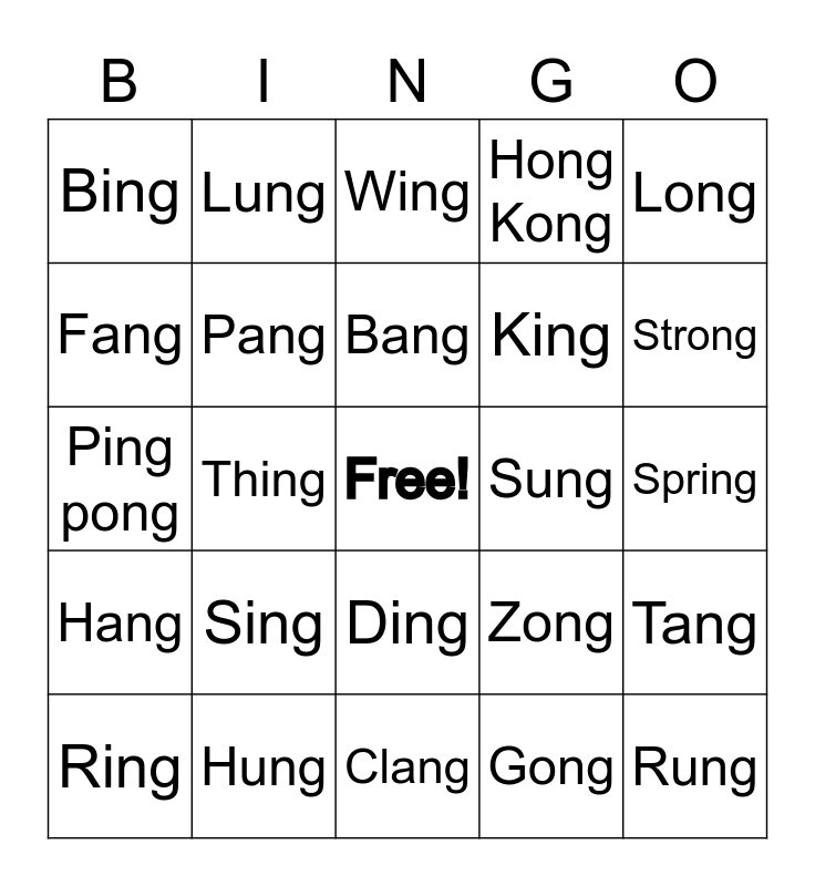 This bingo card has a free space and 24 words: Sing, Hung, Bang, Ring, Long, Bing, Fang, Lung, Sung, Ding, King, Ping pong, Zong, Tang, Pang, Gong, Spring, Wing, Strong, Thing, Rung, Hang, Hong Kong and Clang.