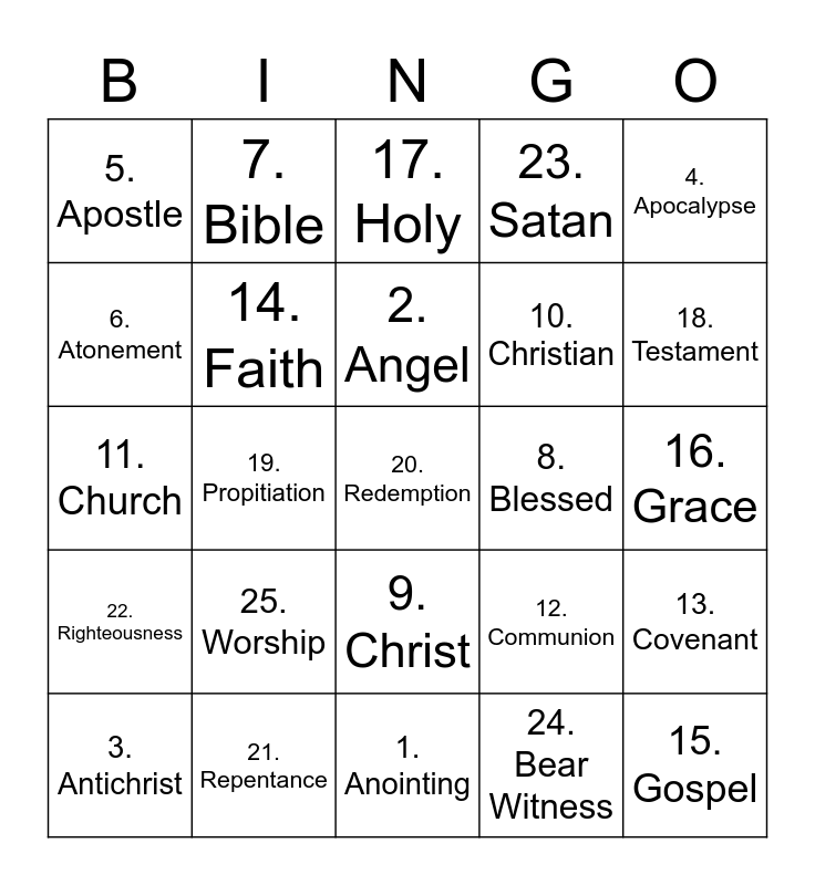 This bingo card has 25 words: 25. Worship, 1. Anointing, 2. Angel, 3. Antichrist, 4. Apocalypse, 5. Apostle, 6. Atonement, 7. Bible, 8. Blessed, 9. Christ, 10. Christian, 11. Church, 12. Communion, 13. Covenant, 14. Faith, 15. Gospel, 16. Grace, 17. Holy, 18. Testament, 19. Propitiation, 20. Redemption, 21. Repentance, 22. Righteousness, 23. Satan and 24. Bear Witness.