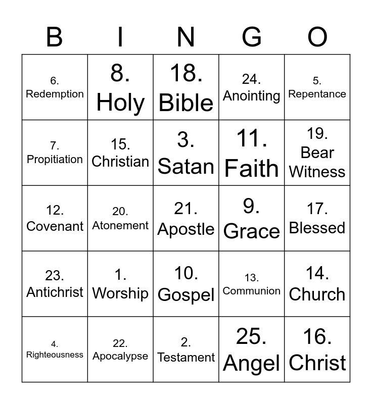 This bingo card has 25 words: 1. Worship, 2. Testament, 3. Satan, 4. Righteousness, 5. Repentance, 6. Redemption, 7. Propitiation, 8. Holy, 9. Grace, 10. Gospel, 11. Faith, 12. Covenant, 13. Communion, 14. Church, 15. Christian, 16. Christ, 17. Blessed, 18. Bible, 19. Bear Witness, 20. Atonement, 21. Apostle, 22. Apocalypse, 23. Antichrist, 24. Anointing and 25. Angel.