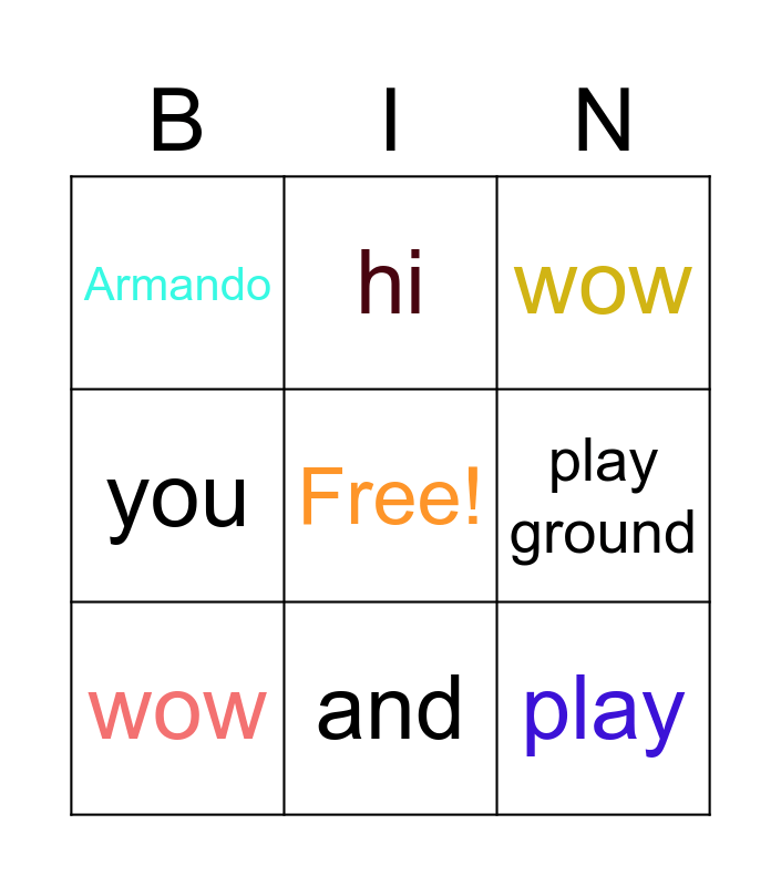 This bingo card has a free space and 24 words: Alexa, Jacob, April, ana, play, Armando, hi, wow, time, to, go, to, the, Beach, wow, yay, mr.leo, you, and, bingo, card, lol, play ground and hip hip.