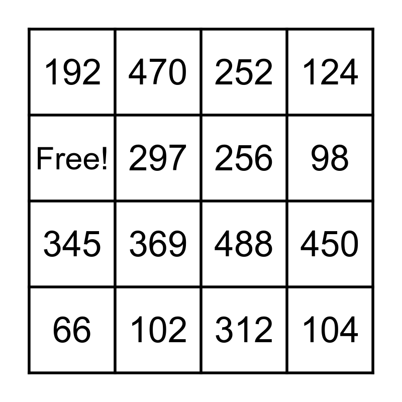 This bingo card has 41 words: 630, 488, 198, 256, 455, 57, 98, 77, Free!, 104, 450, 124, 66, 312, 102, 414, 288, 192, 414, 252, 364, 456, 108, 345, 234, 162, 126, 455, 369, 260, 140, 470, 108, 264, 152, 297, 260, 450, 194, 175 and 666.