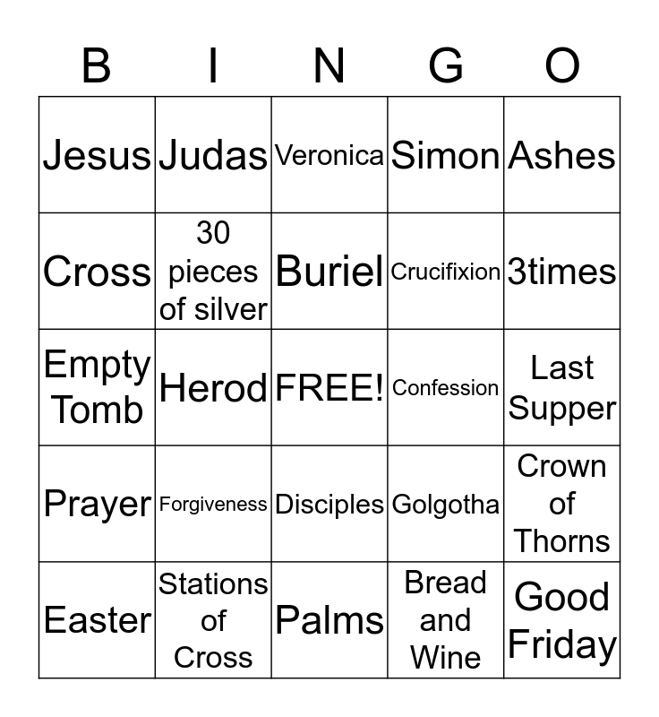 This bingo card has a free space and 24 words: Forgiveness, Stations of Cross, Buriel, Easter, Ashes, Jesus, Cross, Judas, Confession, Disciples, Crucifixion, Empty Tomb, Golgotha, Crown of Thorns, 30 pieces of silver, Bread and Wine, Last Supper, Veronica, 3times, Herod, Good Friday, Prayer, Simon and Palms.