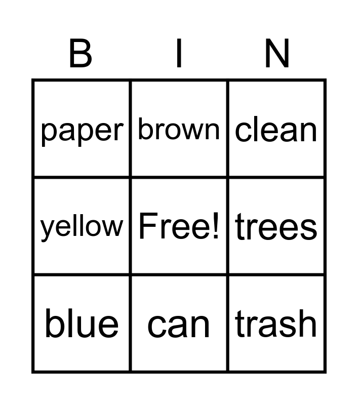 This bingo card has a free space and 14 words: water, earth, blue, brown, yellow, trash, recycle, plastic, can, paper, pollution, trees, clean and environment.
