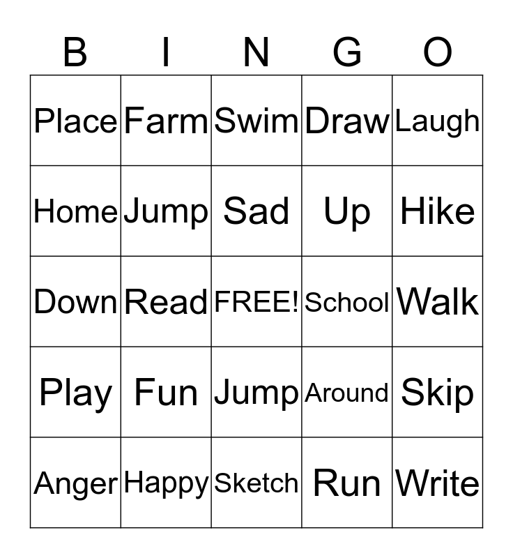 This bingo card has a free space and 24 words: Fun, Happy, Sad, Anger, Laugh, Place, Home, Farm, School, Jump, Up, Down, Around, Skip, Jump, Run, Walk, Swim, Hike, Read, Write, Play, Draw and Sketch.